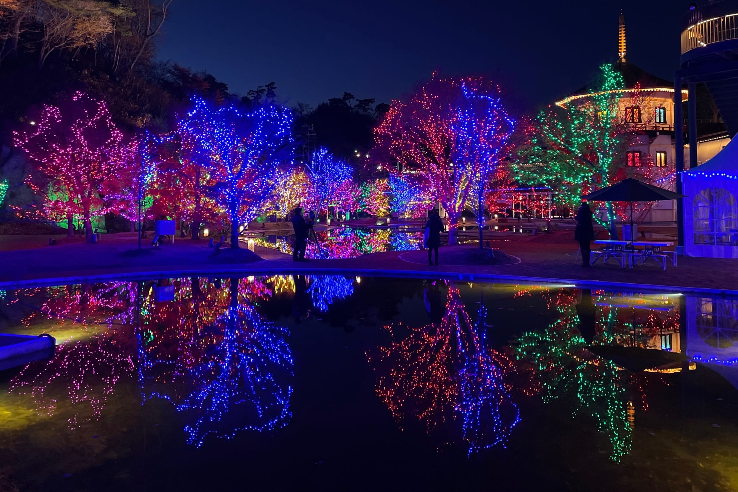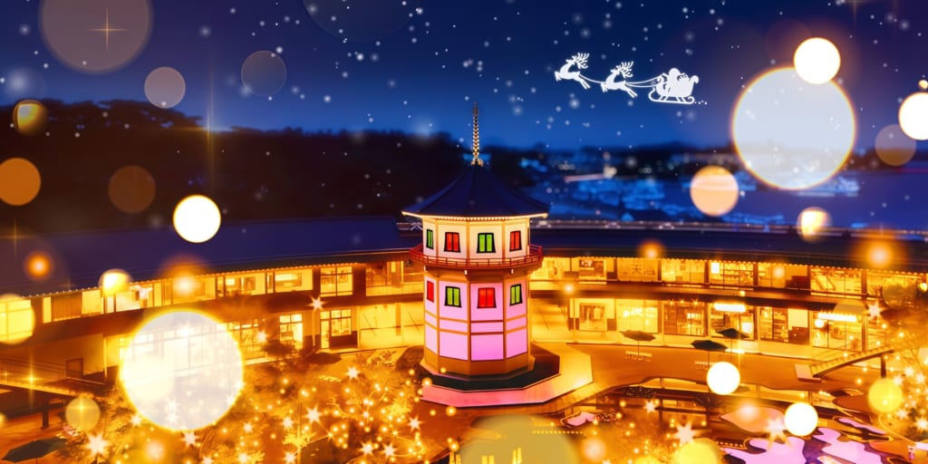 松島離宮のシンボル「レツルタワー」が、開業以来初めてクリスマスカラーにライトアップ。赤と緑に染まる特別な表情は、この時期だけの特別な彩りです。