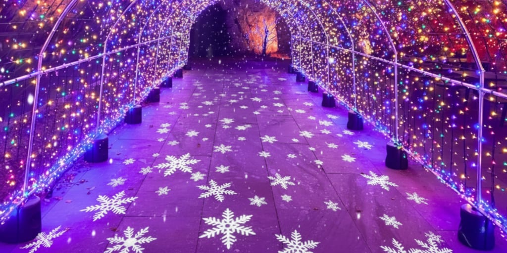 全長10mのイルミネーションアーチが新登場。 一歩足を踏み入れると、足元にはプロジェクターが映し出す無数の「雪の結晶」がきらめきます。 まるで光の雪が舞うトンネルが皆様を幻想の世界へと誘う、絶好のフォトスポットです。