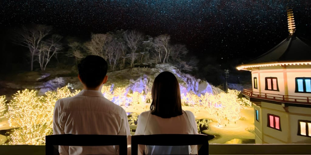 16万球の光が水鏡に映り込む圧巻の景色を、一番高い場所から見渡す「光の展望台」