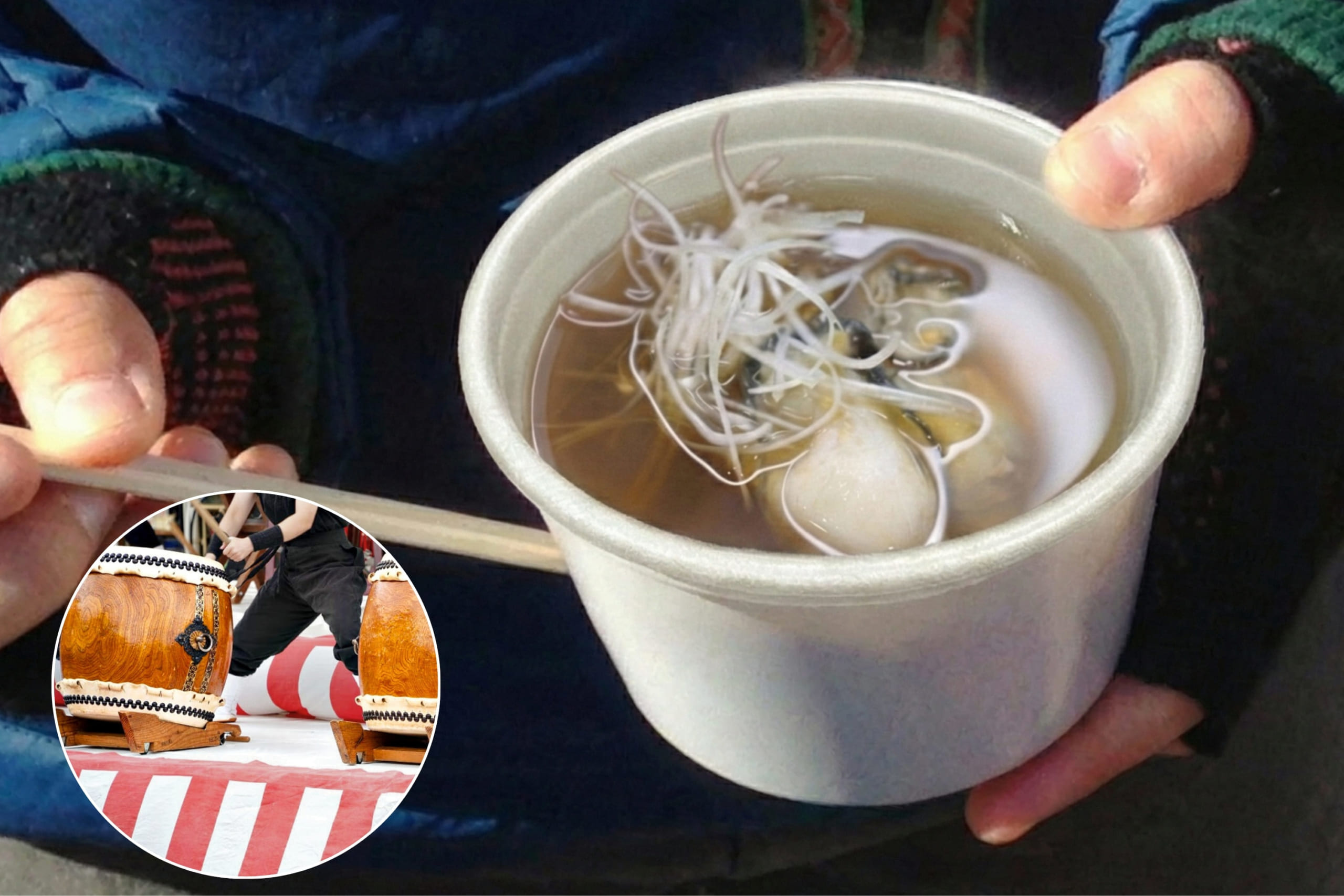 松島グリーン広場で開催される『松島 かき祭り』の開催に合わせて、先着100名様限定で冷えた体に染み渡る「特製 牡蠣汁」を無料で振る舞います。 さらに会場では、松島の繁栄を祈念する迫力の太鼓演奏も披露。伝統の音色が響き渡る中、華やかな幕開けをお楽しみください。